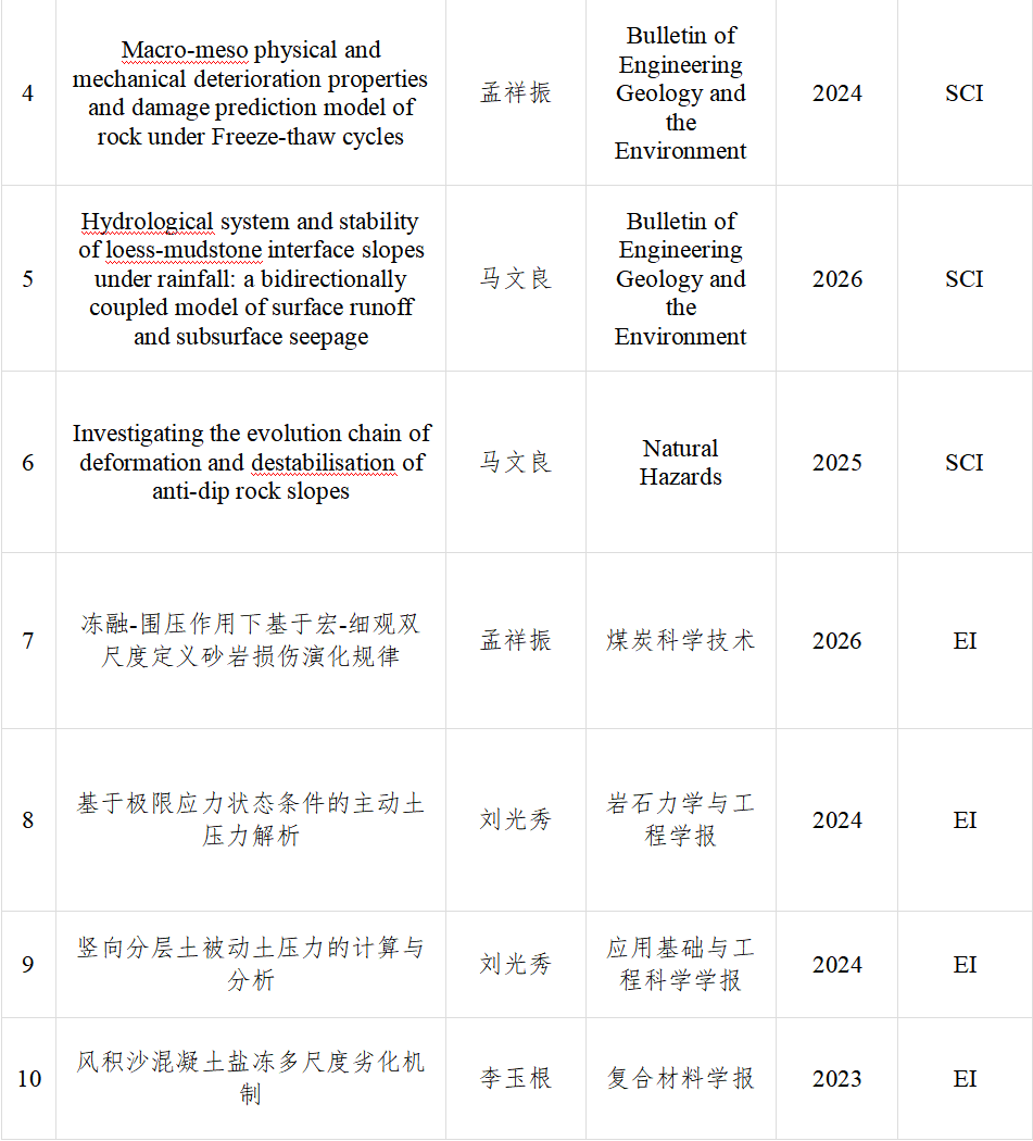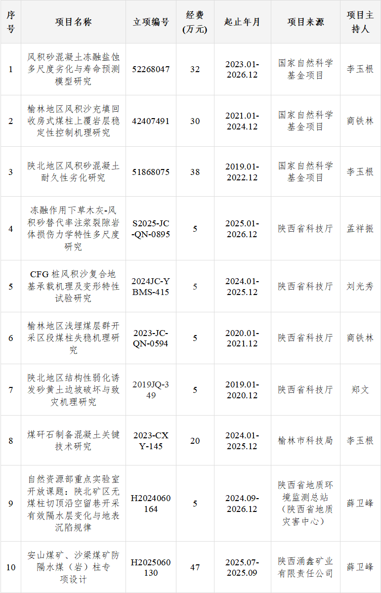矿区环境岩土工程团队主要围绕陕北地区风积砂、黄土等特殊土工程性质及加固处理、边坡稳定性评价、固废资源化利用、裂隙注浆与矿井充填、矿区工程地质、岩土体力学特性、路基工程等开展科学研究,助力区域经济社会发展。团队现有成员10人,其中教授2人,副教授4人,高级工程师1人,硕导7人,博士及在读博士占比100%。近年来团队成员获批各类科研项目30余项,其中国家自然基金3项,省级科研项目5项,厅局级科研项目近20项,科研总经费近600万元。团队成员先后发表高水平论文近50篇,其中SCI、EI检索20余篇,授权专利、软著20余项;获得中国煤炭工业科学技术奖、陕西省自然科学优秀学术论文奖、陕西高等学校科学技术奖、榆林市优秀自然科学学术论文奖等奖励20余项。