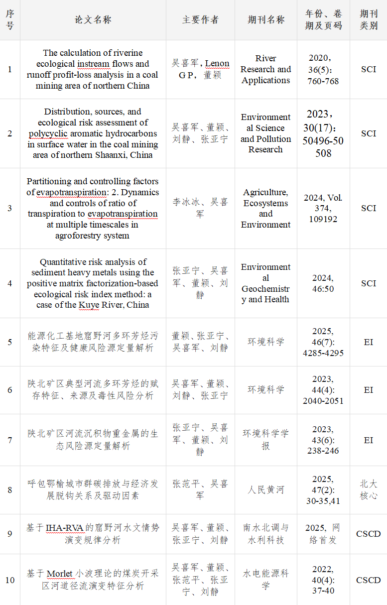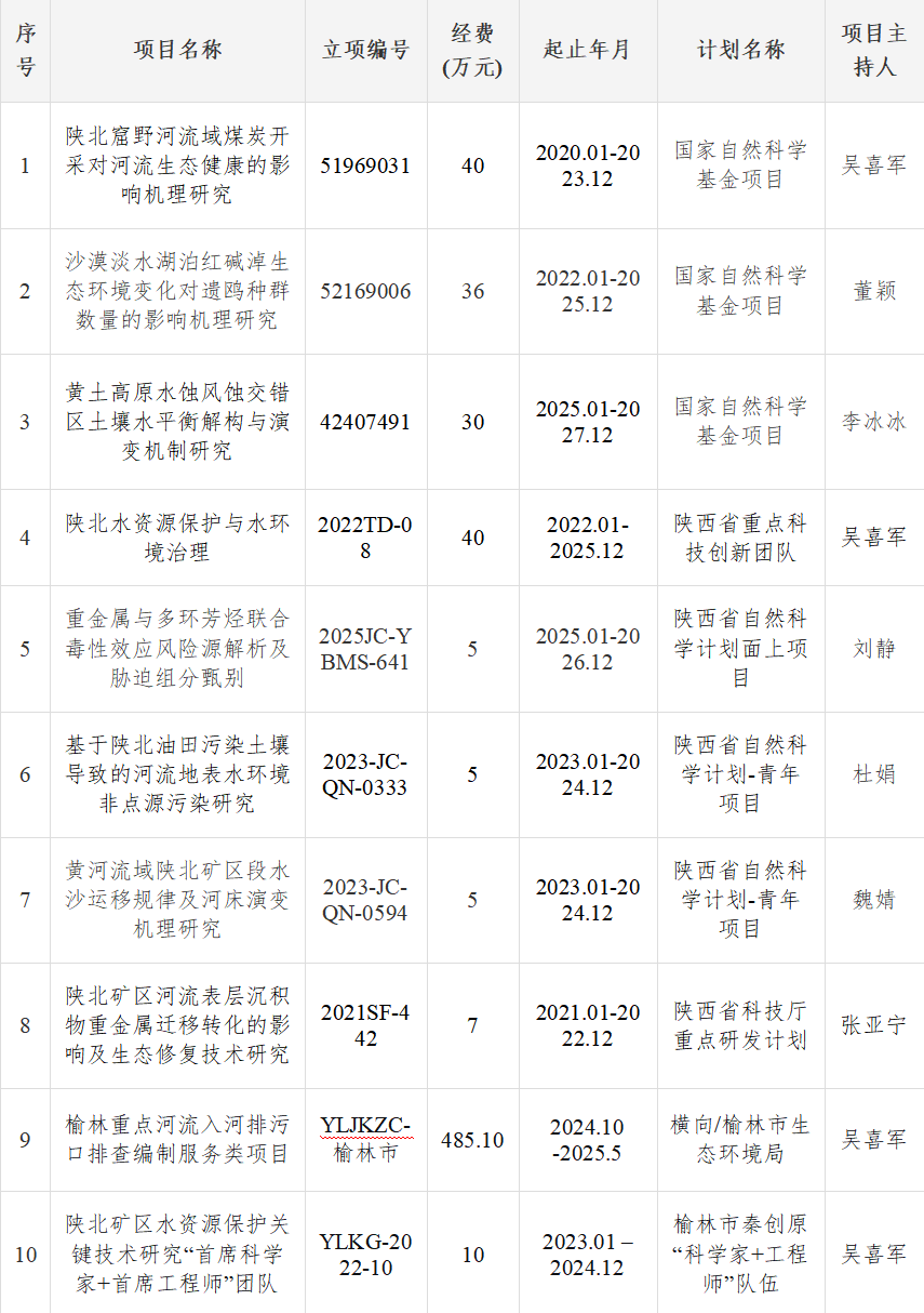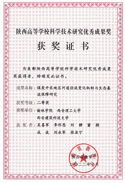 陕北水资源保护与水环境治理团队组建于2014年,2022年获批为陕西省科技创新团队,团队负责人为吴喜军教授。团队10多年来围绕陕北地区水资源保护与高效利用,以及水环境污染防治与治理开展了大量科学研究。团队现有成员15人,其中博士9人,有国外访学经历4人。团队成员近5年获批各类科研项目50多项,其中国家自然基金4项,省级科研项目10余项,科研总经费1000余万。团队成员先后发表高水平论文100多篇,获批专利30多项、软件著作权10余项,荣获陕西省环境保护科技奖一等奖,陕西省高等学校科学技术奖,陕西省自然科学优秀学术论文奖等省、厅级奖励20余项。团队负责人吴喜军先后荣获陕西省“特支计划”区域发展人才,陕西省中青年科技创新领军人才、榆林市有突出贡献专家等荣誉。