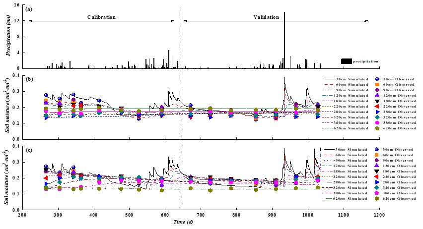 1. 识别了土地利用和气候变化在土壤水平衡中的主导性。前期评估了水文模型HYDRUS-1D模拟渭北旱塬深剖面土壤水分的适用性,受到广泛关注,应用生态学报(2019)已被下载1000余次、引用70余次,并于2023年入选为高被引论文。基于气候数据评估土地利用变化对土壤水平衡各组分影响,发现农地转为林地并随林龄增加,蒸散发量增加,而土壤蓄水量和地下水补给明显减少(Agriculture, Ecosystems & Environment,2019, IF=6.4)。结合未来气候变化情景,发现蒸散发受气候变化主导,而深层渗漏受土地利用变化控制(Agriculture,water management, 2020, IF=6.5)。