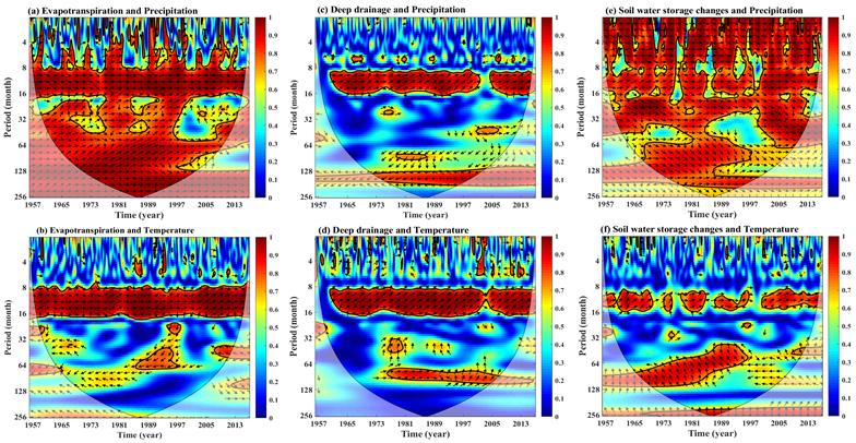 图4 土壤水平衡各组分与气候因子的双变量小波相干