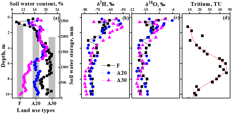 (a:土壤含水量和土壤储水量;b:氢同位素;c:氧同位素;d:氚同位素含量)