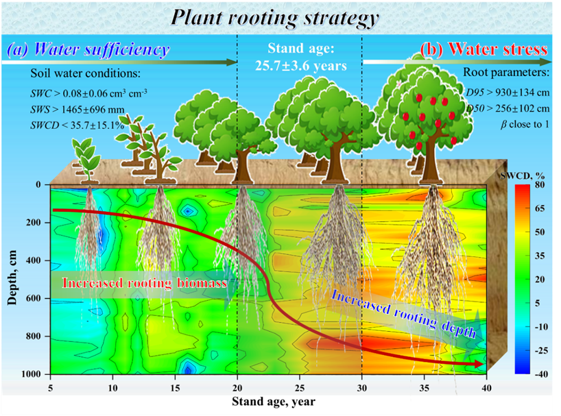 这一发现的应用价值深远:(1)指导林分管理:它告诉我们的林业工作者和果农,当一片林子或果园达到一定树龄和土壤干燥化程度时,就需要警惕深层土壤水的过度消耗。这可以指导我们进行合理的间伐、修剪甚至轮作,以避免形成难以恢复的深层干层,实现植被的可持续管理。(2)预警生态风险:对于正在经历气候变暖、干旱加剧的黄土高原,这一“临界点”可以作为评估区域生态系统稳定性和退化风险的早期预警指标之一。