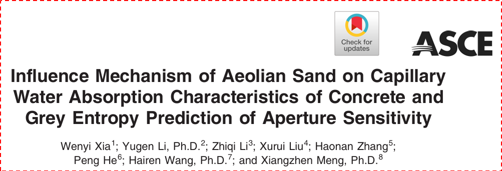 《Journal of Materials in Civil Engineering(SCI三区》于2026年第38卷第2期刊发建筑工程学院“绿色建筑材料及工程结构耐久性团队”研究成果。成果以“Influence Mechanism of Aeolian Sand on Capillary Water Absorption Characteristics of Concrete and Grey Entropy Prediction of Aperture Sensitivity”为题,2023级土木水利研究生夏文艺为第一作者,李玉根教授为通讯作者。