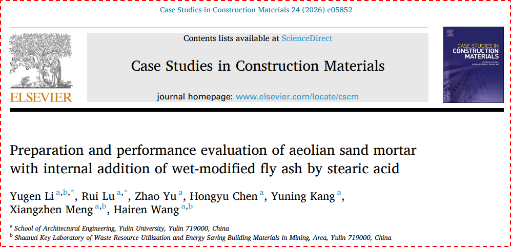 近日,《Case Studies in Construction Materials(二区TOP,IF 6.6)》刊发建筑工程学院“ 绿色建筑材料及工程结构耐久性团队”研究成果。成果以“Preparation and performance evaluation of aeolian sand mortar with internal addition of wet-modiffed ffy ash by stearic acid”为题,2024级土木水利研究生陆睿为第二作者及共同通讯作者,李玉根教授为第一作者。