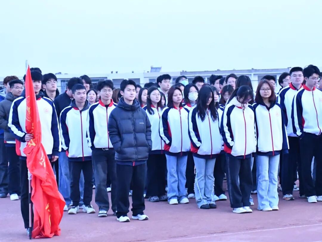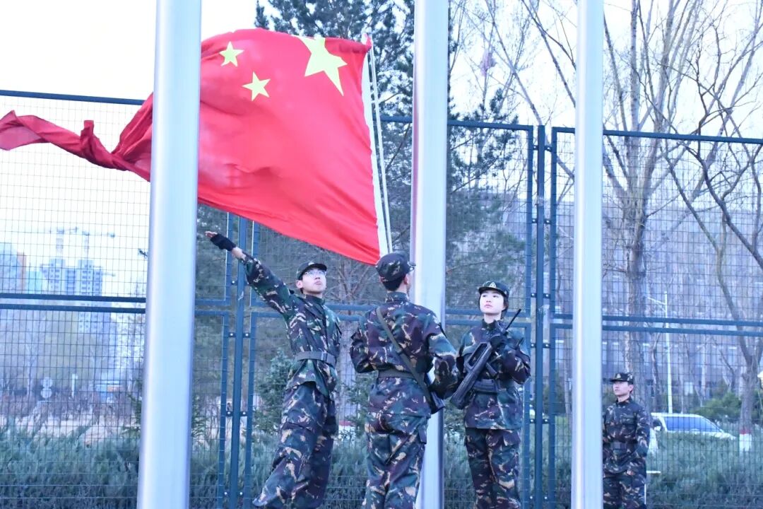 随着《义勇军进行曲》的庄严旋律,五星红旗冉冉升起。全体学生肃立,高唱国歌。