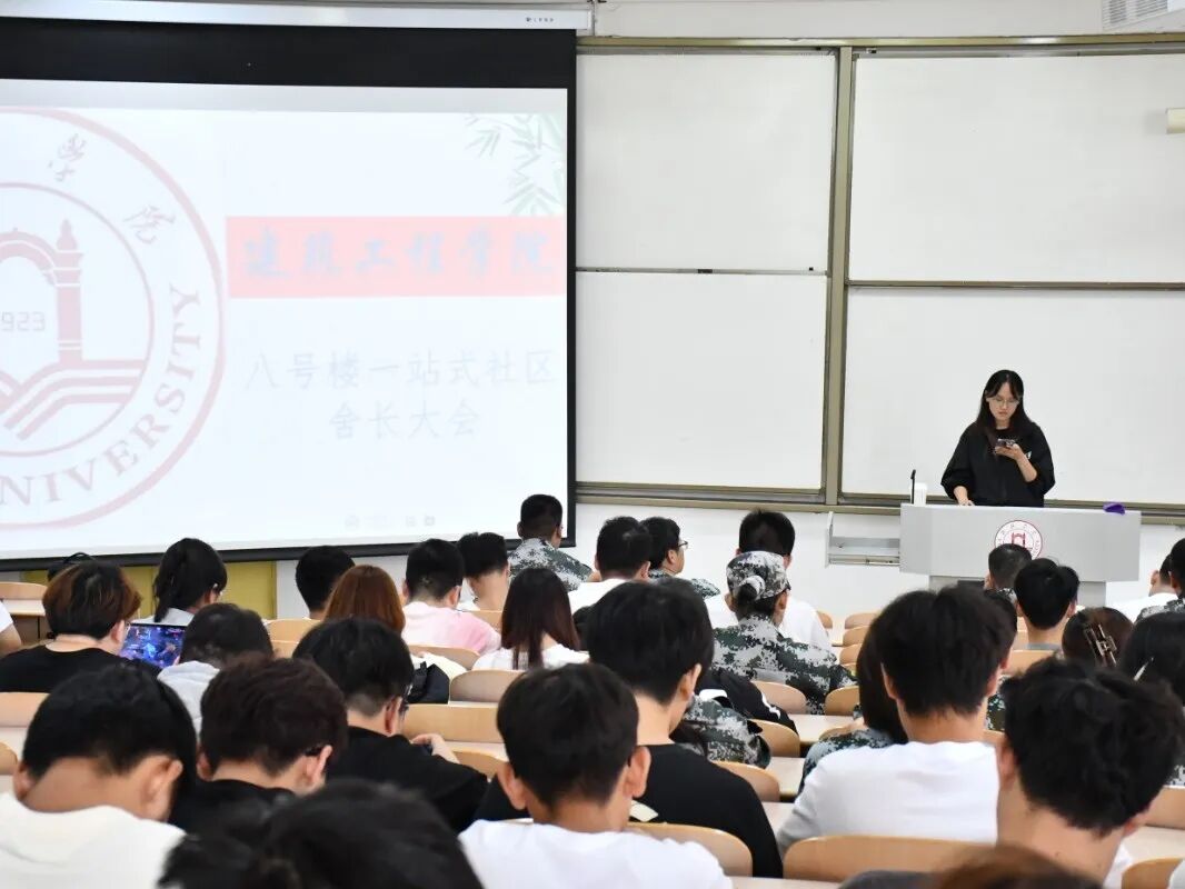 为加强学生宿舍的卫生与安全管理,精准传达并落实学校及学院各项通知要求,推动宿舍管理工作高效开展,建筑工程学院于2025年9月3日中午12:30在5301教室召开了8号公寓楼“一站式”学生社区舍长大会,全院宿舍舍长参会。舍长作为宿舍管理的重要角色,是连接学院与同学的关键桥梁,其责任担当意识直接关系到宿舍生活的质量与安全。