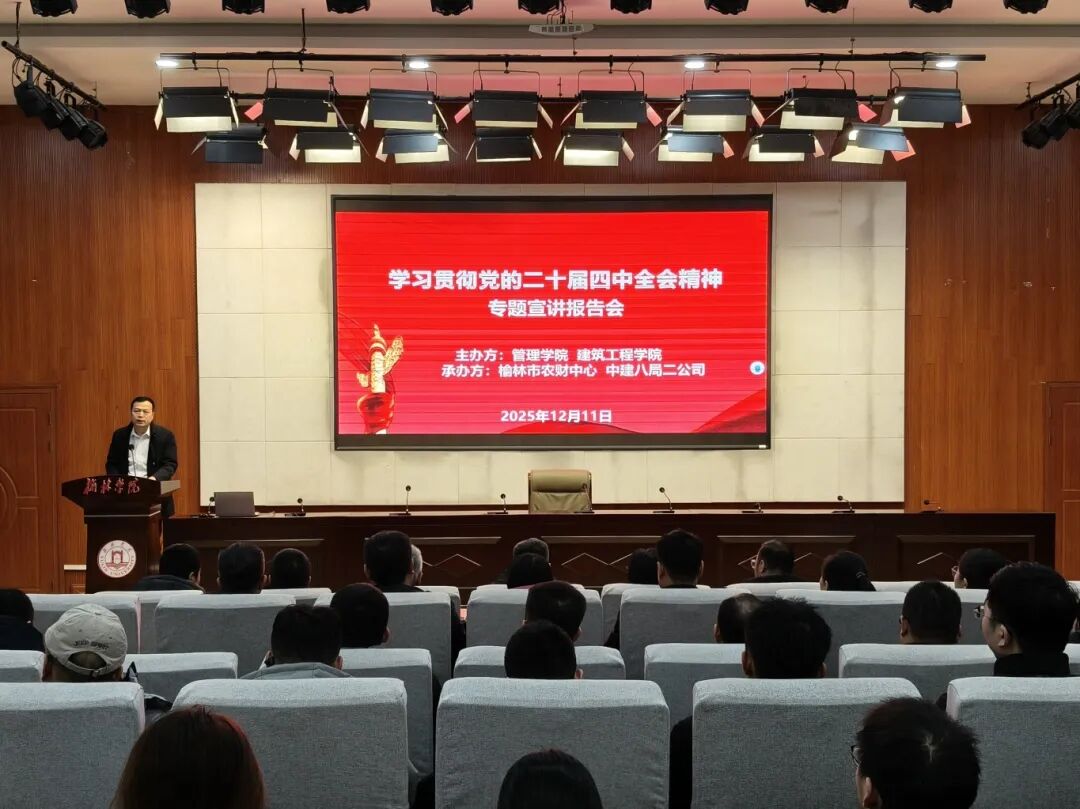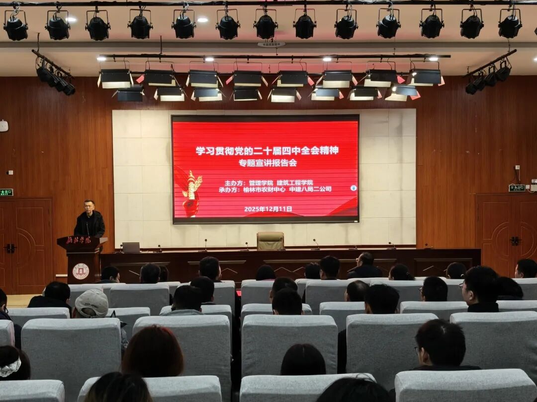 为深入学习贯彻党的二十届四中全会精神,进一步强化理论武装、凝聚思想共识,以党建引领深化校地企协同,推动全会精神与教育教学、科研实践及地方服务深度融合,2025年12月11日下午14:30,建筑工程学院、管理学院联合榆林市农财中心、中建八局二公司在逸夫楼一楼报告厅组织召开学习贯彻党的二十届四中全会精神专题宣讲会。宣讲会特邀榆林学院党委副书记、纪委书记苗延宏,马克思主义学院艾霞老师作专题宣讲。建筑工程学院与管理学院领导班子、企业党员代表、两院全体教师及学生党员参加学习。会议由建筑工程学院党总支书记薛国栋主持。