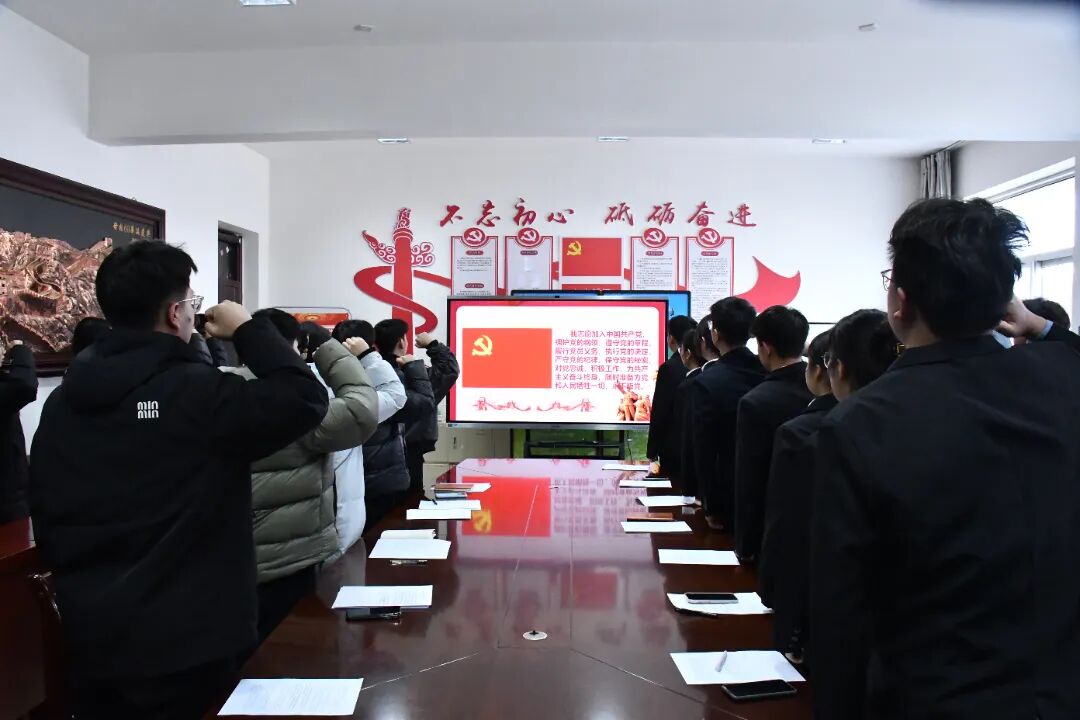 学生党支部副书记韦泽涛带领全体党员庄严宣誓:“我志愿加入中国共产党,拥护党的纲领,遵守党的章程,履行党员义务。执行党的决定,严守党的纪律,保守党的秘密,对党忠诚,积极工作,为共产主义奋斗终身,随时准备为党和人民牺牲一切,永不叛党。”