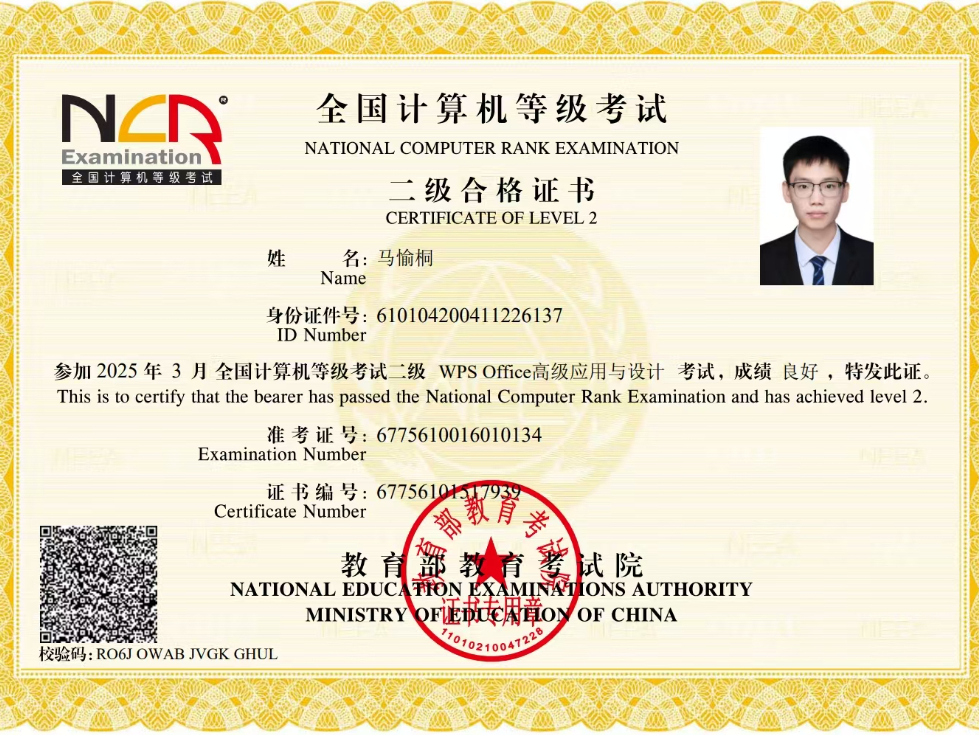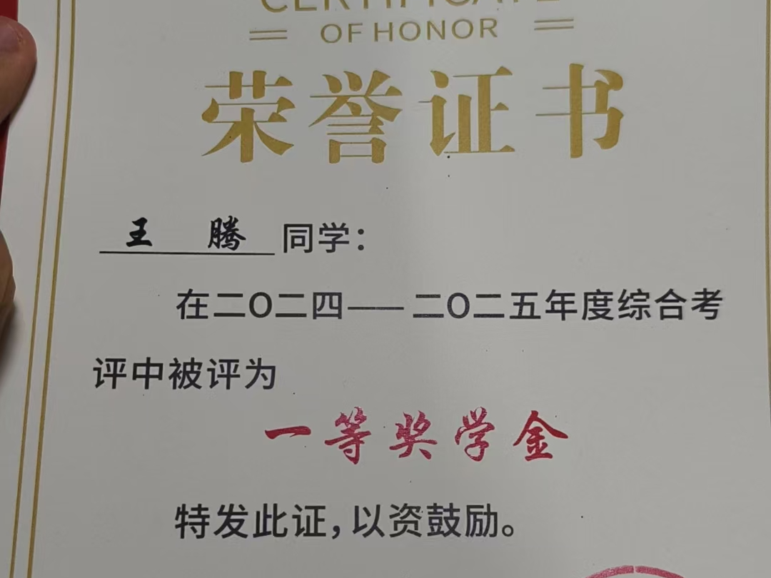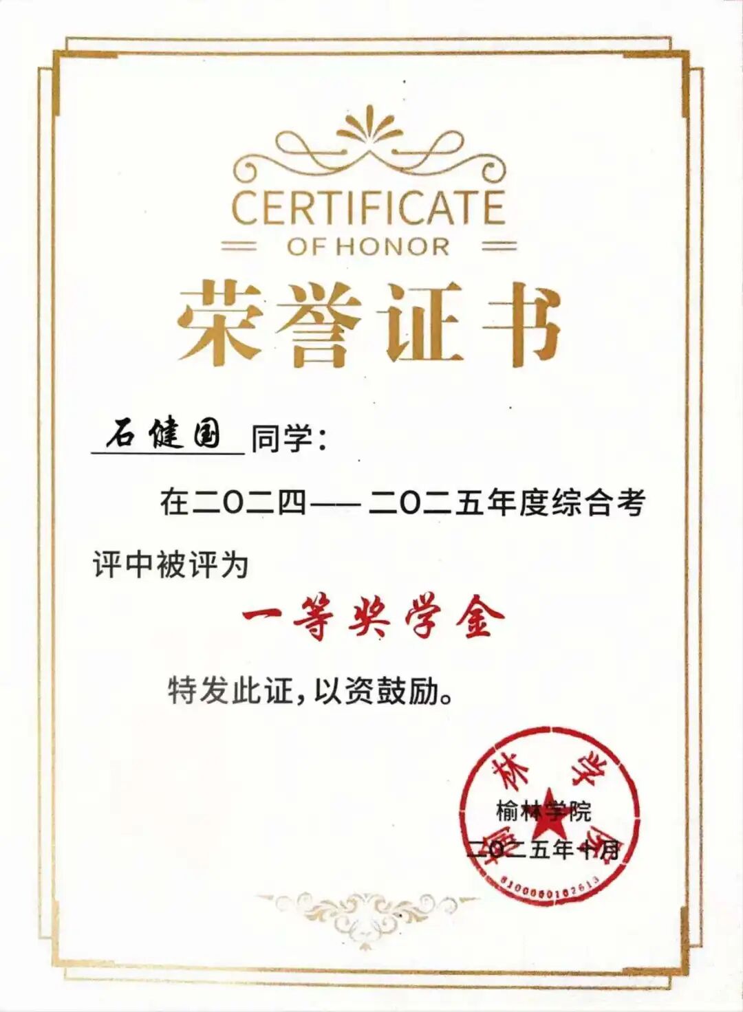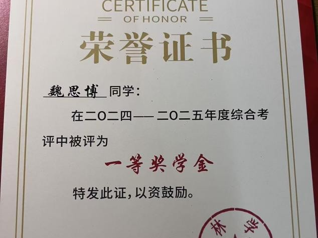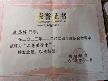 学业方面,他学习认真,掌握了专业知识,通过英语CET-4考试,并获得校一等奖学金与校二等奖学金。