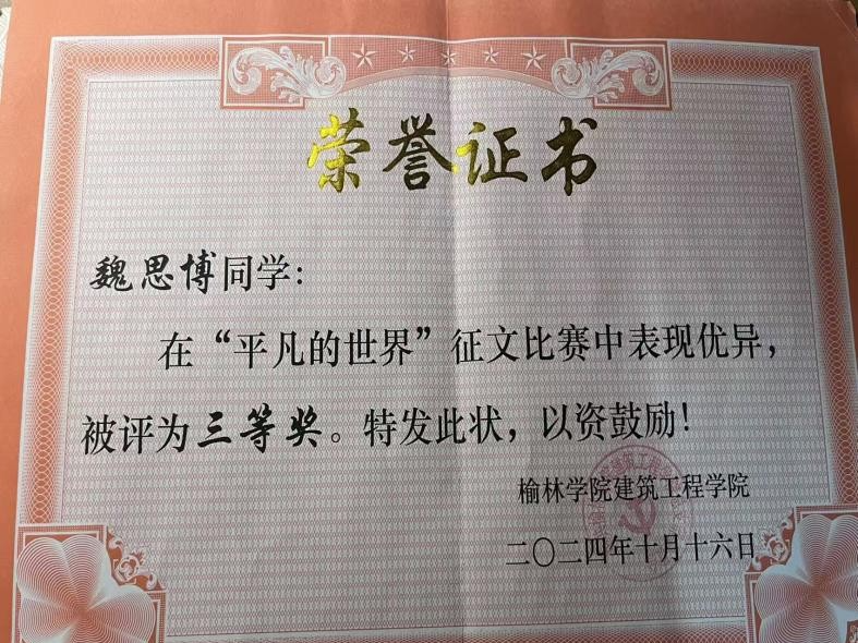 竞赛方面,参加《平凡的世界》征文比赛,并荣获三等奖,展现了良好的文字表达与人文素养。