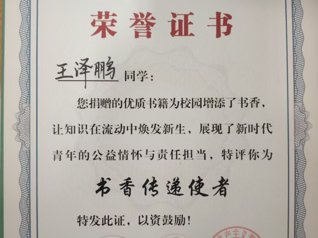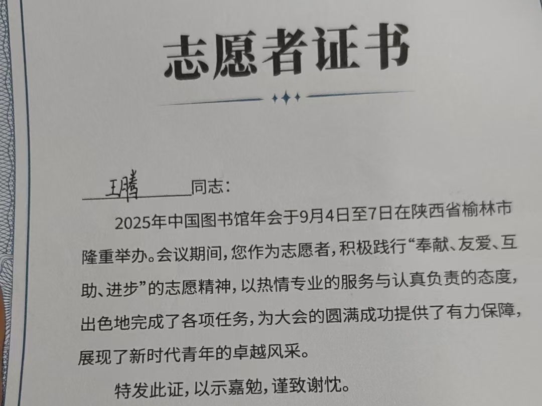 课余期间,他积极参与多项实践与志愿服务,包括连续五天参与中国图书馆年会志愿服务工作,保障活动流程顺利进行,获“优秀志愿者”称号;此外,他还参加了暑期“三下乡”社会实践、马克思主义原理课程相关研学活动,积累了实践经验。
