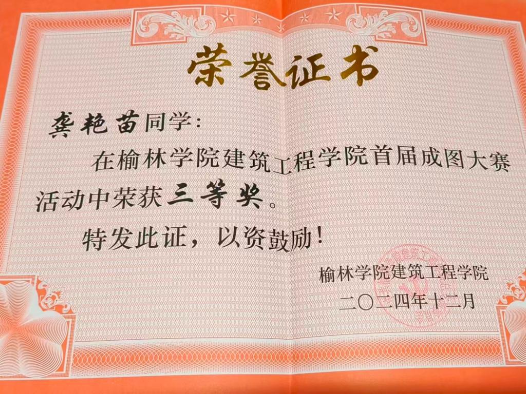 在学科竞赛方面,她聚焦专业能力锤炼,踊跃参与学科竞赛,先后在院系建筑结构设计大赛中获优秀奖、院系成图大赛中获三等奖,以实践夯实专业技能。这些经历不仅丰富了她的大学生活,更塑造了其直面挑战、向阳成长的品格。未来,她将坚守初心、脚踏实地,不负荣誉与期许,稳步迈向新征程。