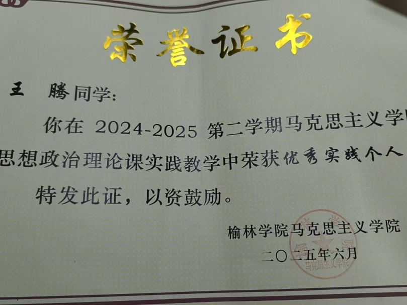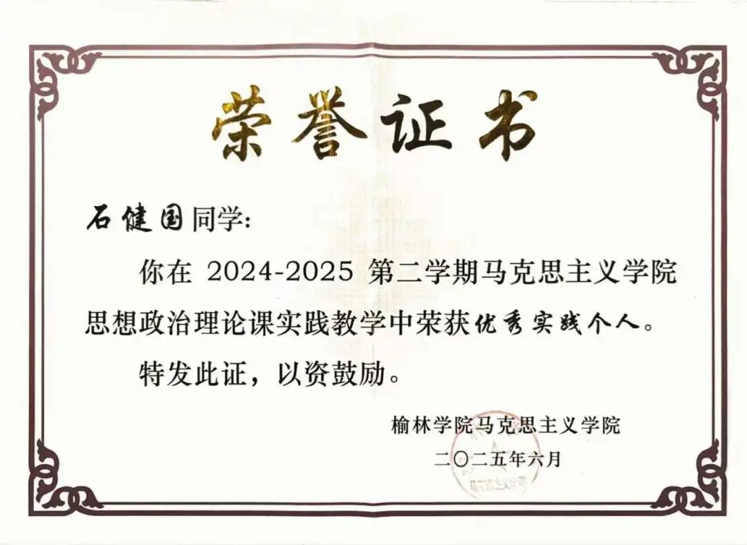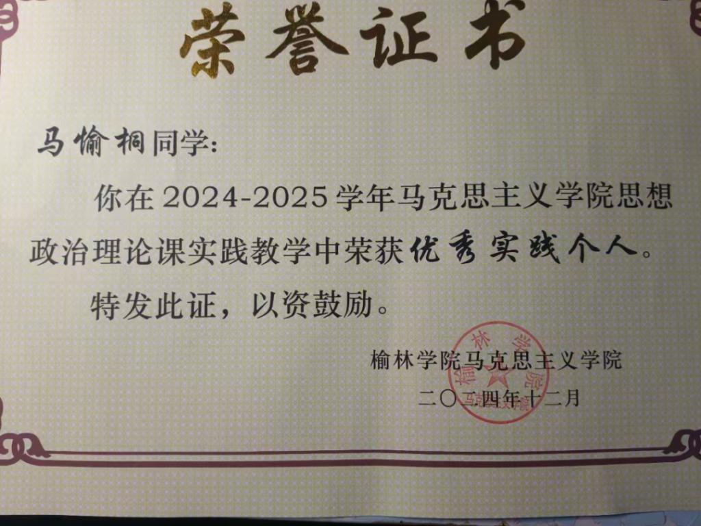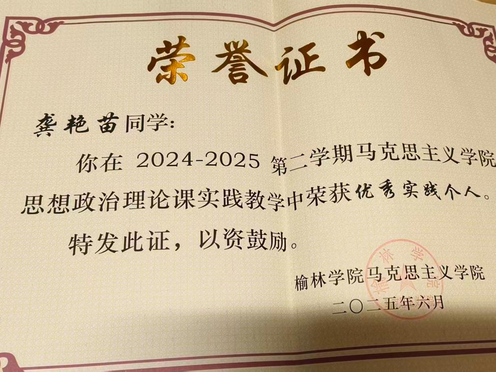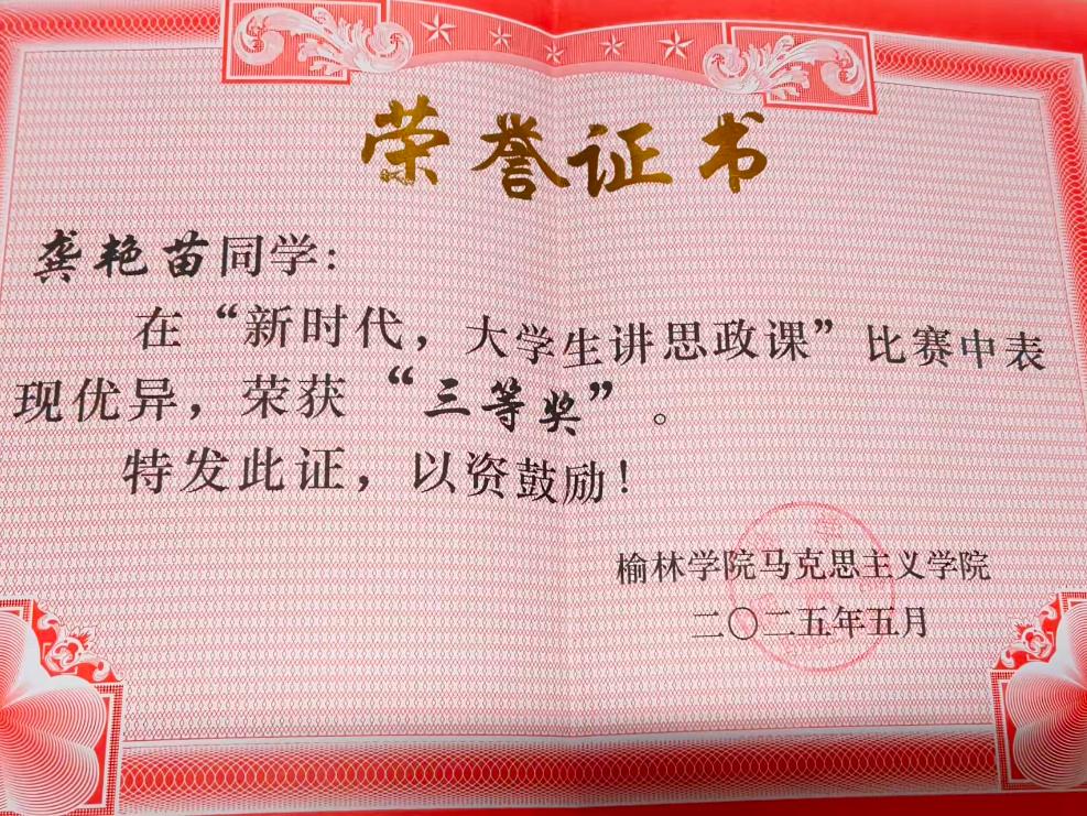 她积极参与各类实践活动,在“大学生讲思政课”比赛中获三等奖,获评思想政治理论课优秀实践个人,于理论运用与表达实践中持续提升综合素养。