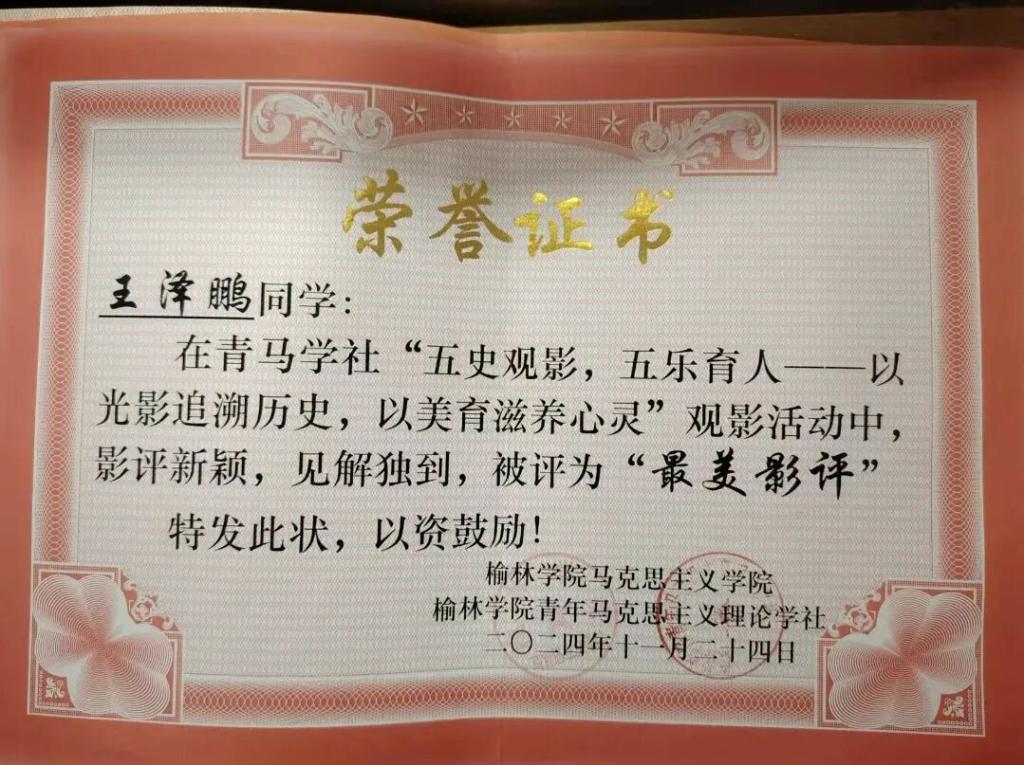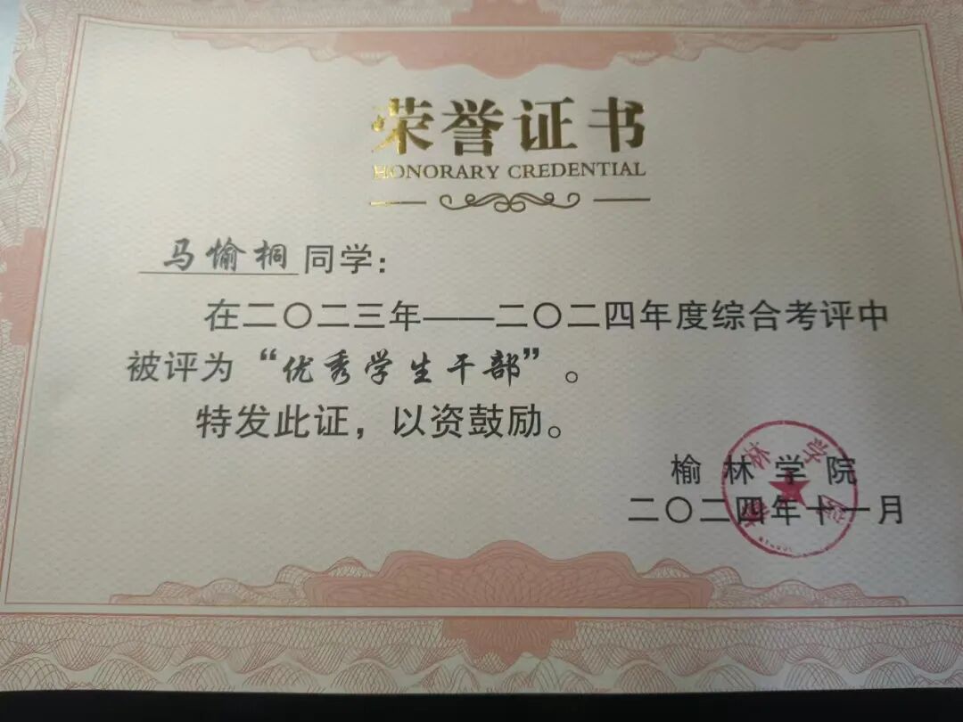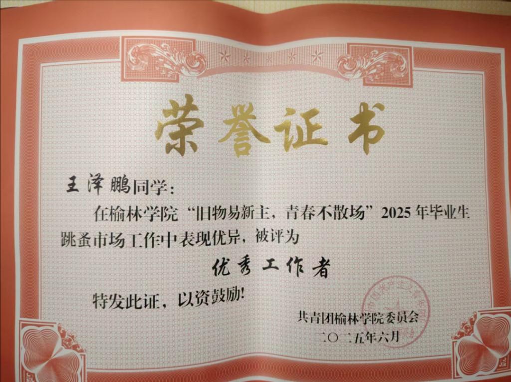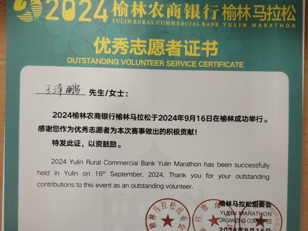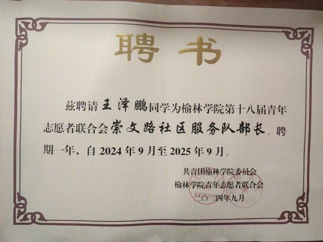 课余时间,他积极投身各类实践与志愿服务:参与学校迎新工作,助力新生快速融入校园;连续担任2024年、2025年榆林马拉松志愿者,传递奉献精神;走进社区开展少儿兴趣培养公益活动,在服务他人、奉献社会中锤炼综合能力、传递温暖。