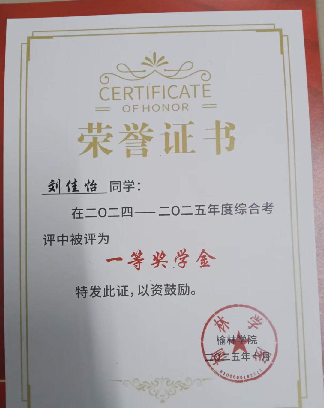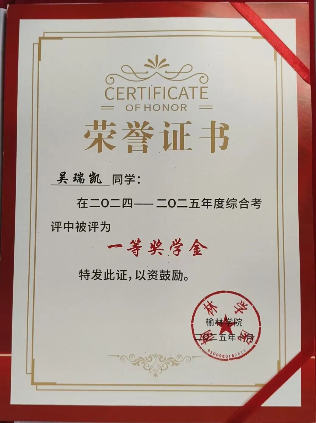 榆林学院2024-2025年度综合考评一等奖学金