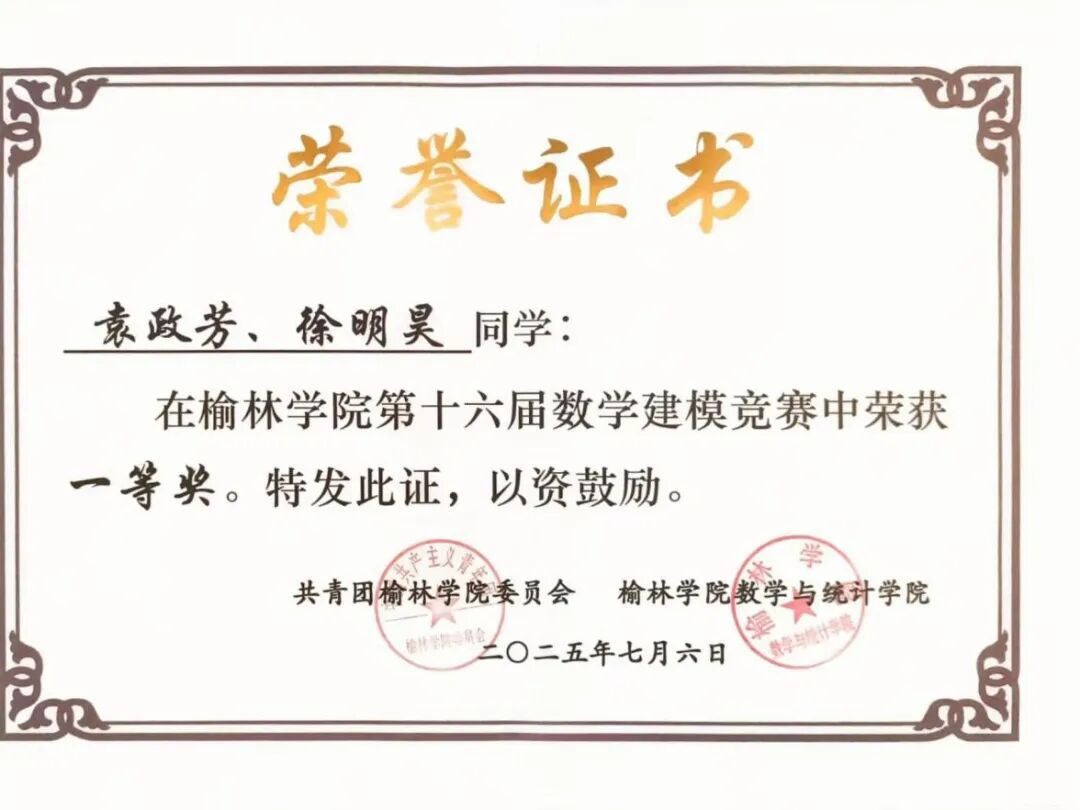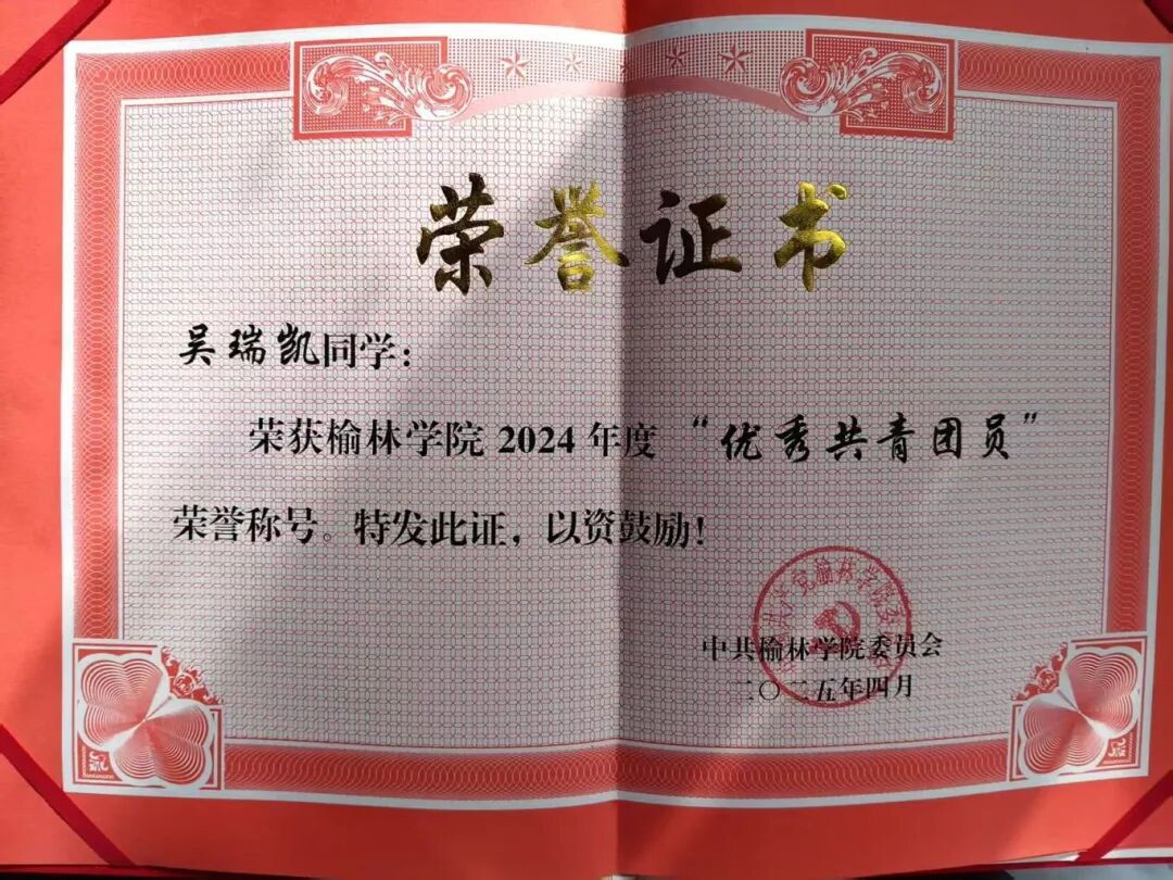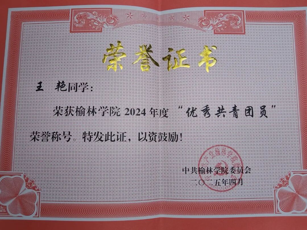 学习上,她态度端正,专业成绩优异,获得2024-2025学年国家励志奖学金;积极参与学科竞赛,获数学建模竞赛校一等奖、大学生职业规划比赛院一等奖、团干部素质大赛院二等奖。