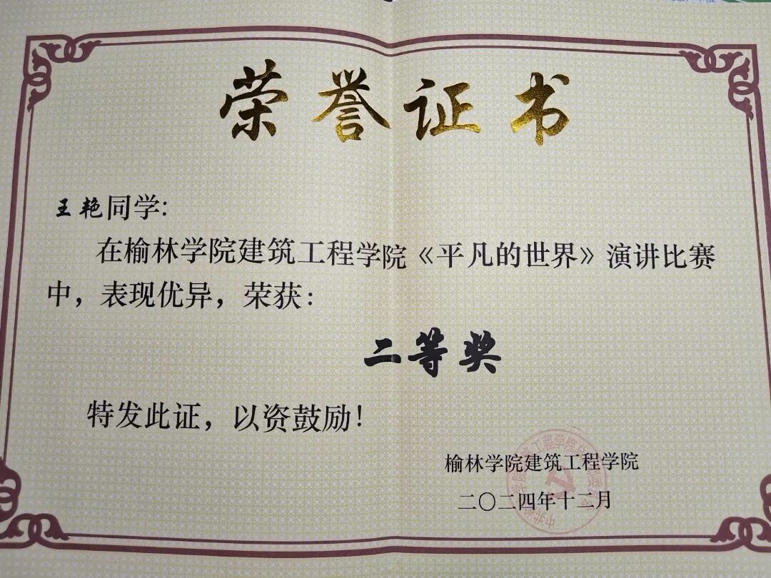 在竞赛方面,她以提升专业能力为目标,积极参与各类学科竞赛,在榆林学院建筑工程学院首届结构竞赛中,她与团队成员协作完成作品,最终获得校级二等奖;在节能减排竞赛中,她同样与团队共同优化方案,荣获校级二等奖。通过参与多项竞赛,她的创新思维与团队协作能力得到了提升。
