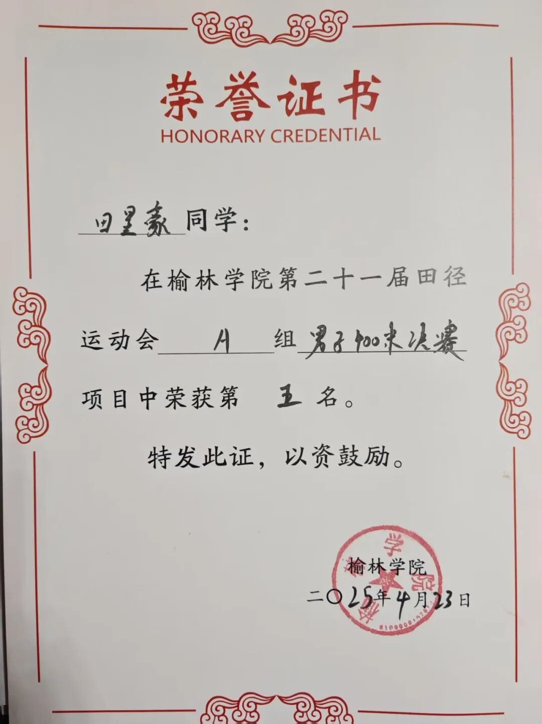 运动会400米第五名